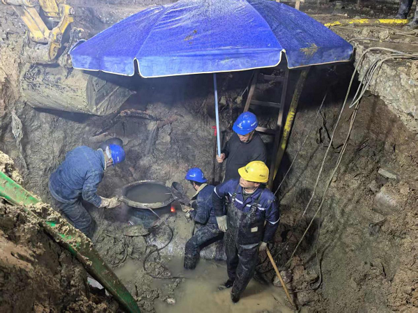 12月31日凌晨0時,搶修正式開始。寒風裹挾雨雪肆虐,現場泥濘濕滑,搶修隊員們不畏嚴寒、沖鋒在前,在刺骨的泥水中分工協作、爭分奪秒。經過四個多小時的連續奮戰,凌晨4時許,破損管道成功修復,供水恢復正常。此次連夜搶修,比原計劃提前4小時恢復供水,不僅彰顯了公司運維隊伍召之即來、來之能戰、戰之能勝的過硬作風,更以實際行動踐行了“以人民為中心”的服務宗旨,為臨空經濟區的穩定運行提供了堅實的供水保障。