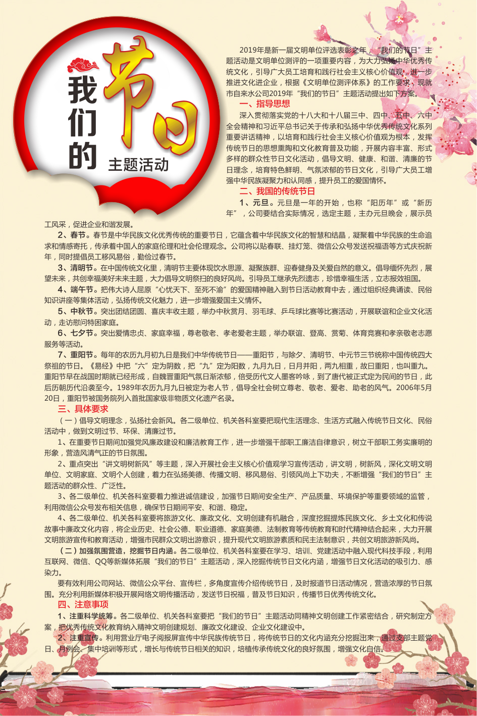 2019年是新一屆文明單位評選表彰之年,“我們的節(jié)日”主題活動(dòng)是文明單位測評的一項(xiàng)重要內(nèi)容,為大力弘揚(yáng)中華優(yōu)秀傳統(tǒng)文化,引導(dǎo)廣大員工培育和踐行社會(huì)主義核心價(jià)值觀,進(jìn)一步推進(jìn)文化進(jìn)企業(yè),根據(jù)《文明單位測評體系》的工作要求,現(xiàn)就市自來水公司2019年“我們的節(jié)日”主題活動(dòng)提出如下方案。